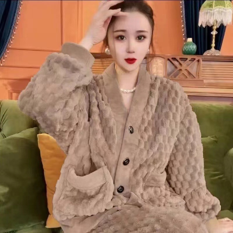 フランネルの寝衣春と秋の厚いプラスの長さの浴衣の朝の長衣の2024年の冬の新型のサンゴの絨毛のパジャマの女性