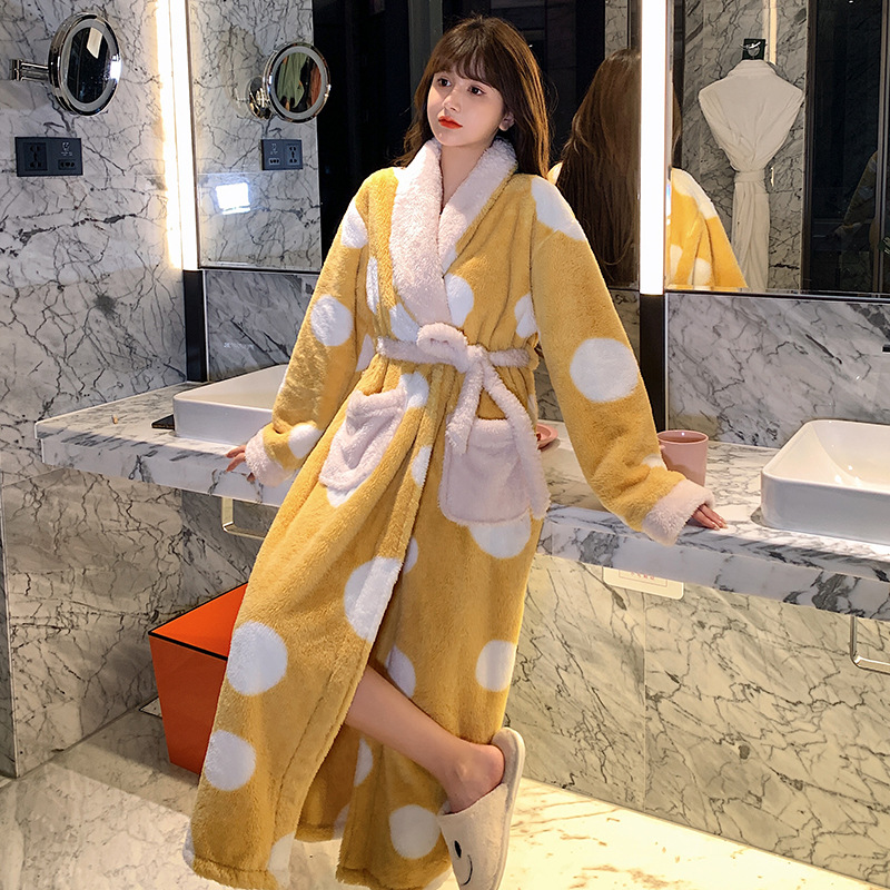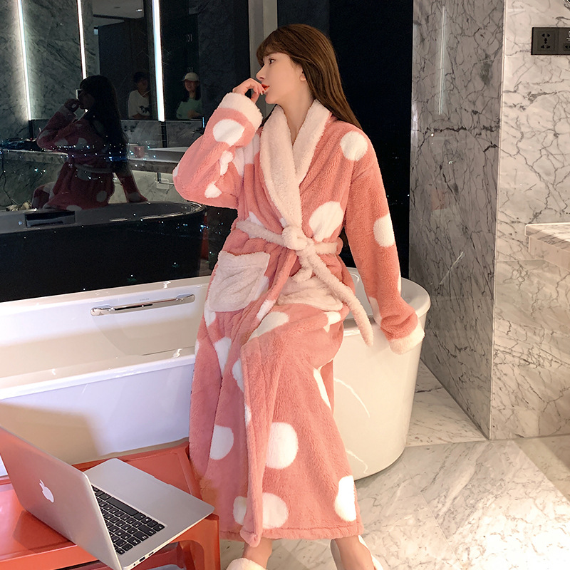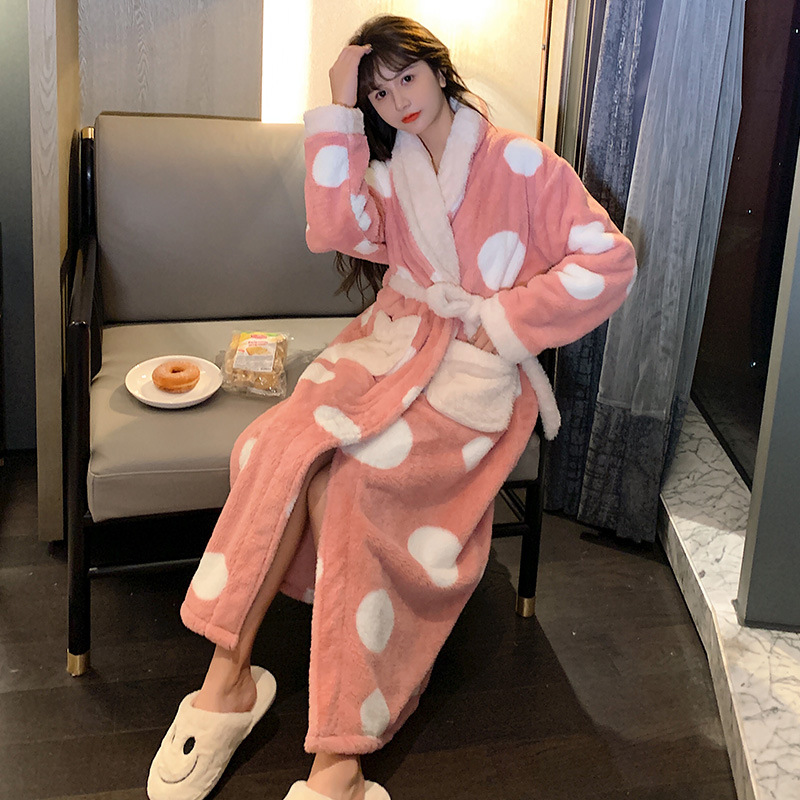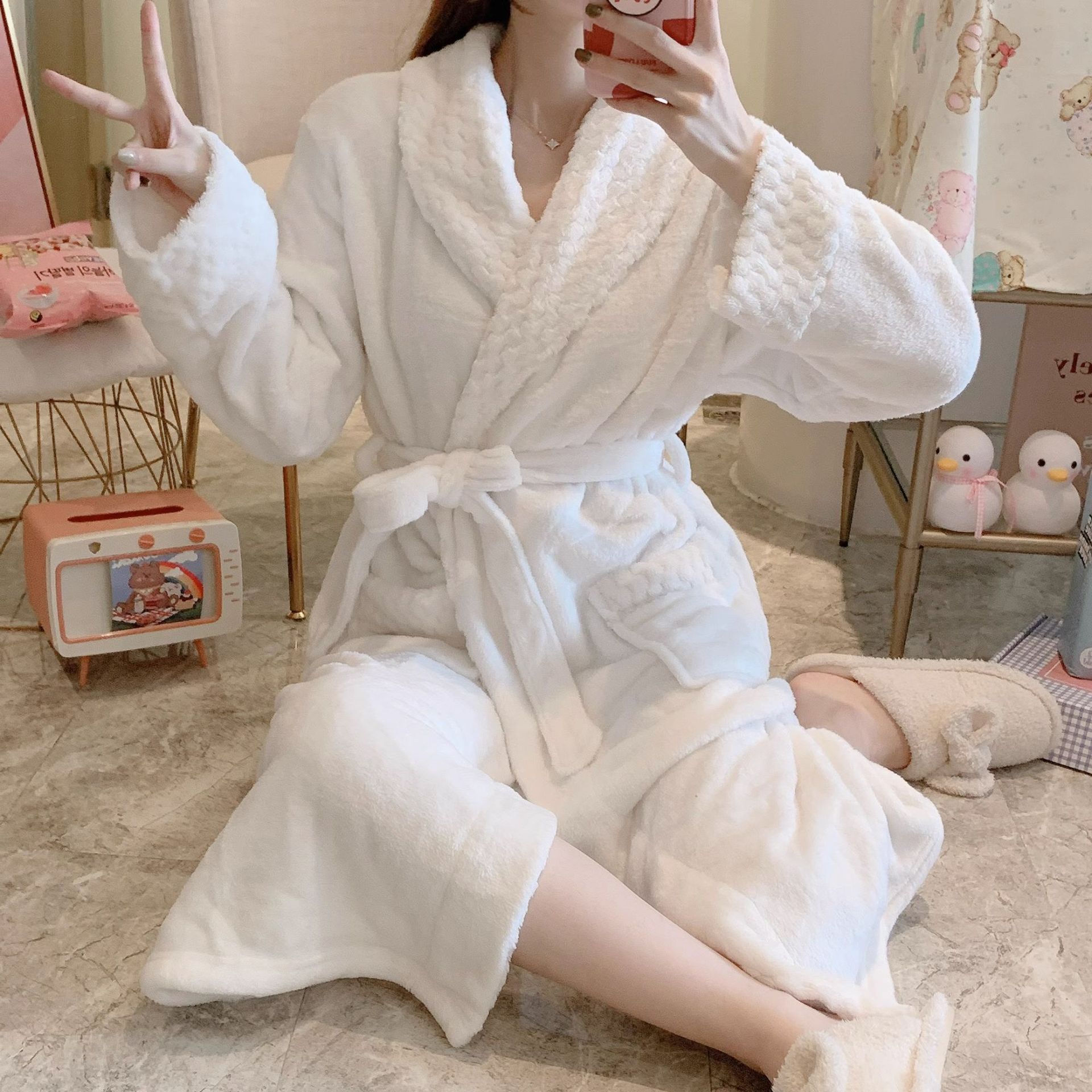 サンゴのベルベットのパジャマの女性は冬にベルベットを厚くして寝ているローブの長いタイプのかわいい膝のフランネルのバスローブを着て2024年に新しい