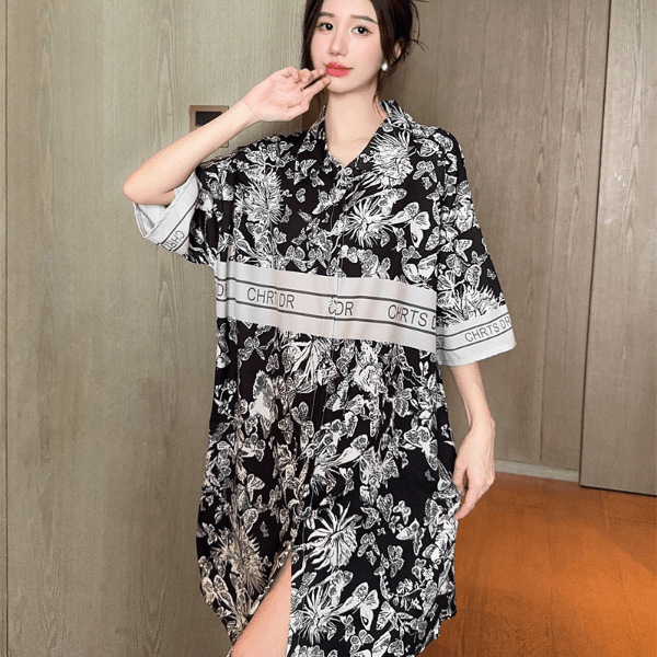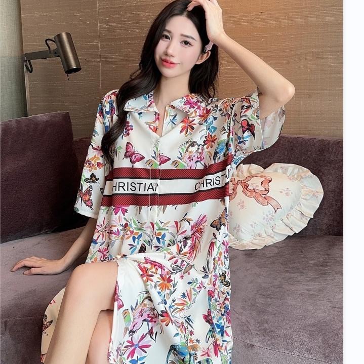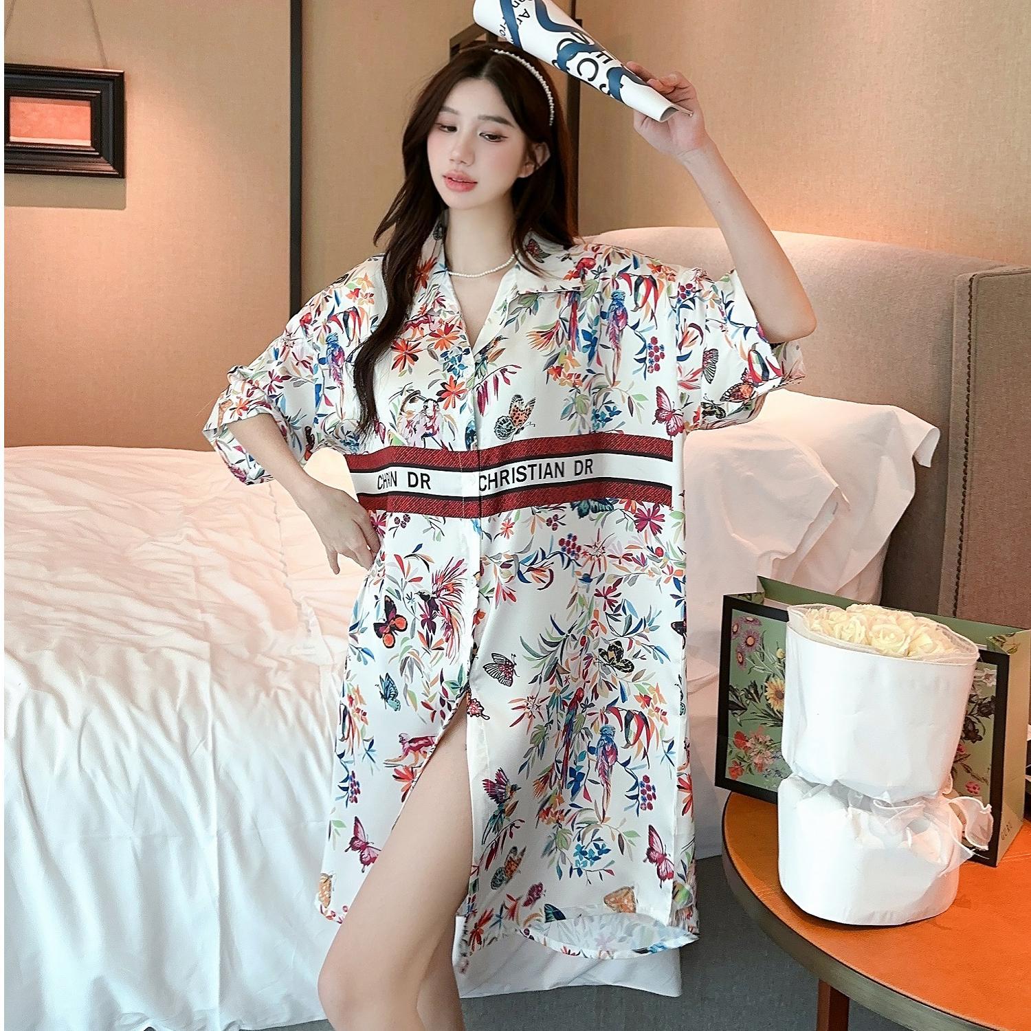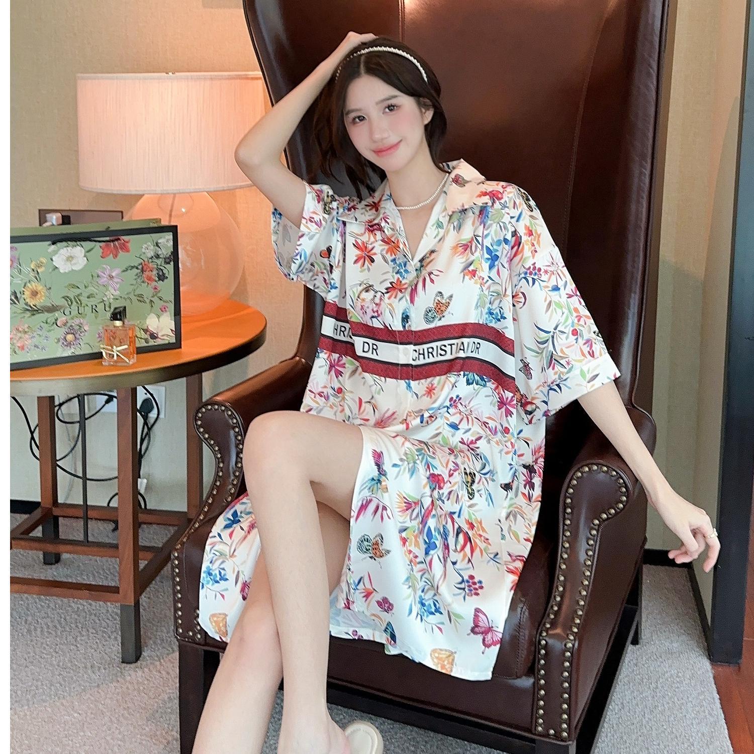 2024春夏の新型プリントシャツスカート寝スカート女性氷糸軽贅沢高級感パジャマ春秋薄手スポット