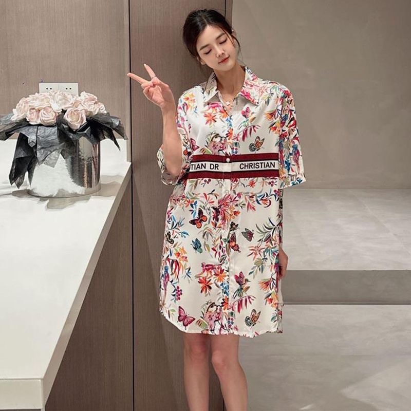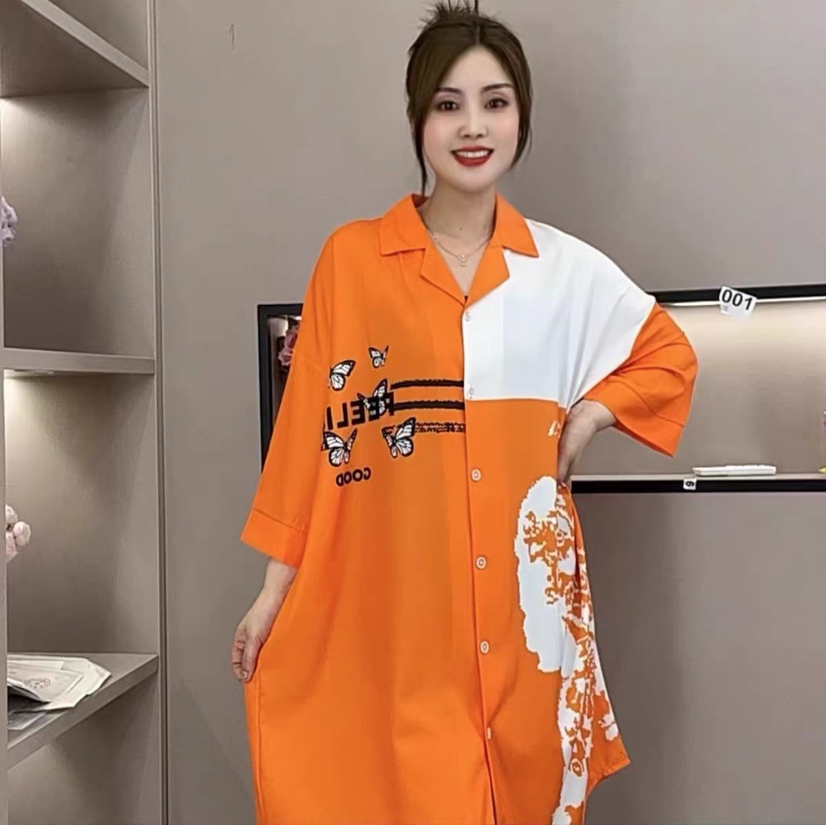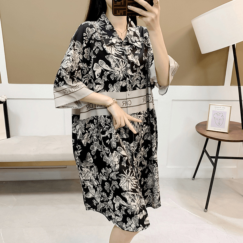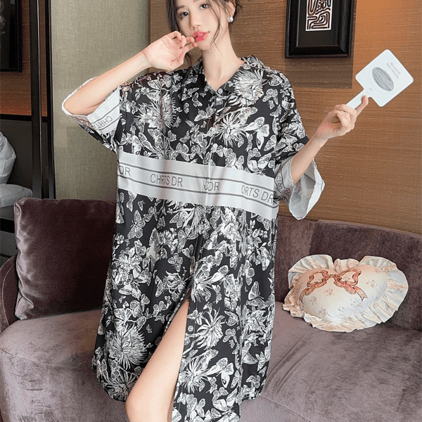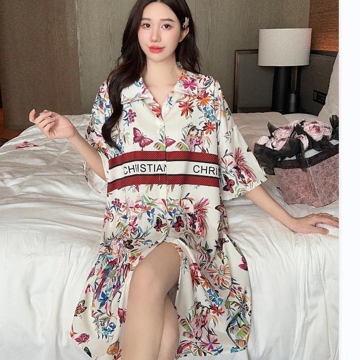 2024春夏の新型プリントシャツスカート寝スカート女性氷糸軽贅沢高級感パジャマ春秋薄手スポット