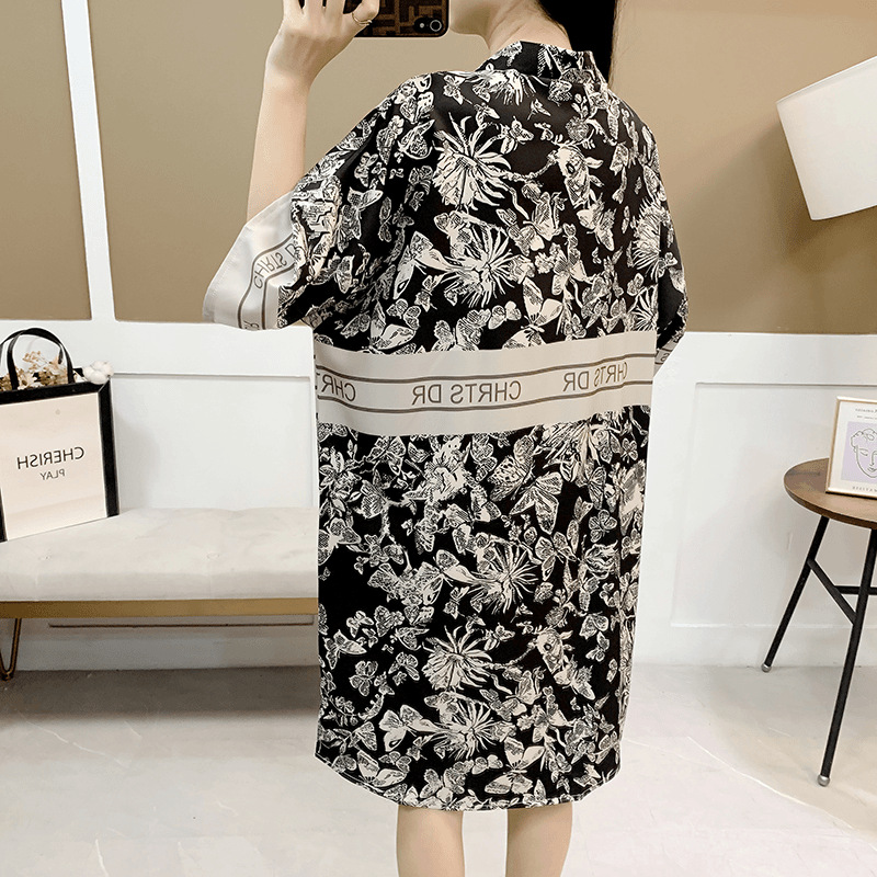 蝶の氷の糸の眠るスカートの女性の夏のカーディガンの半袖の長いスカートの高級感の柔らかい光のサテンのシルクの韓国版の家の服
