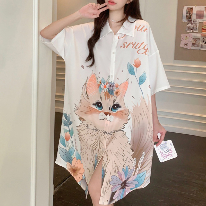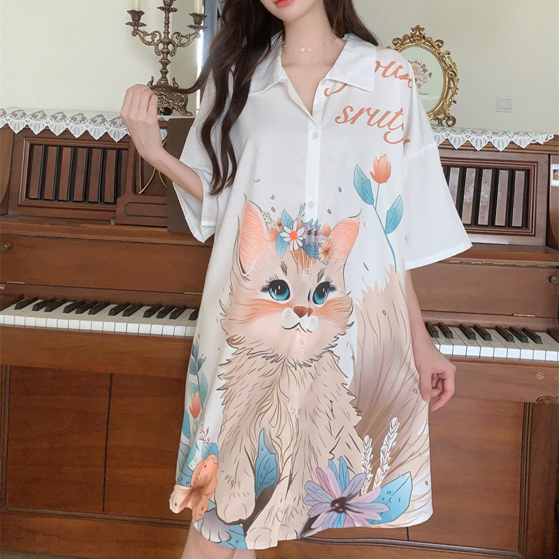 夏のディザトーンの爆発的な半袖の寝たスカートの洋風のかわいい漫画の猫の氷の糸は膝のシャツのネットの赤い家の服を越えます。