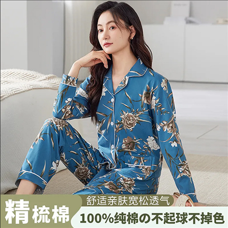 雲綿パジャマ女2024春秋の新高級感プリント長袖長ズボンの家庭服セットは外着ができます。
