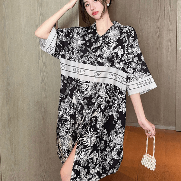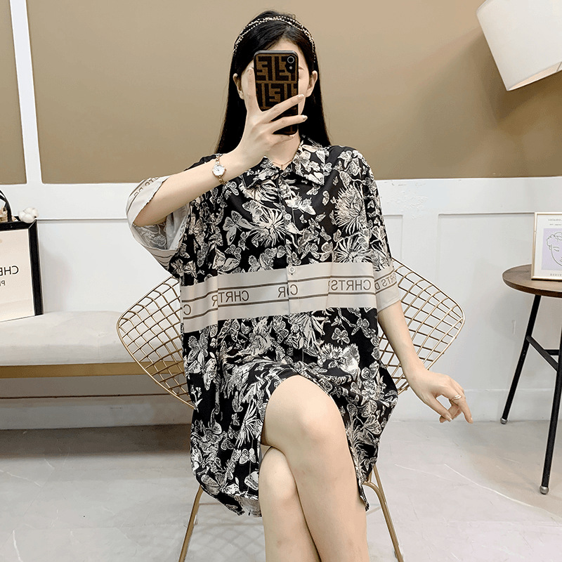 ネットレッド2024新型黒金パジャマ女夏氷糸半袖高級感大サイズシャツ寝スカート外着ホームウェア
