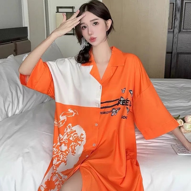 Douyinの人気の新しいナイトガウンアイスシルクミッドレングス外出用ホームウェア純粋な欲望スタイルシャツパジャマ女性夏