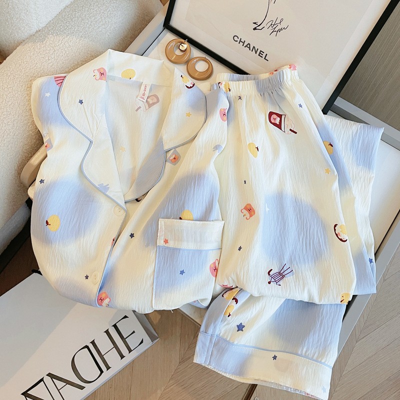 雲の綿の春の夏のパジャマの女性2025年の新型の長袖の満印の漫画の猫の家の服の夏は外にスーツを着ることができます。