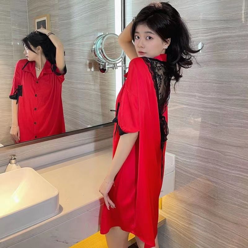 パジャマレディース夏2025年新作氷糸ナイトドレス赤いシルク高級感セクシーレースシャツナイトドレス