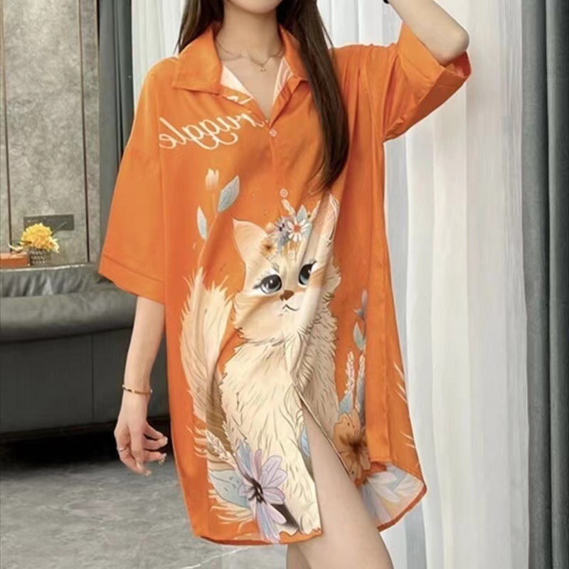 震え音ネット赤起爆シルクの寝スカート女性夏の高級感猫はシャツを着て寝ている