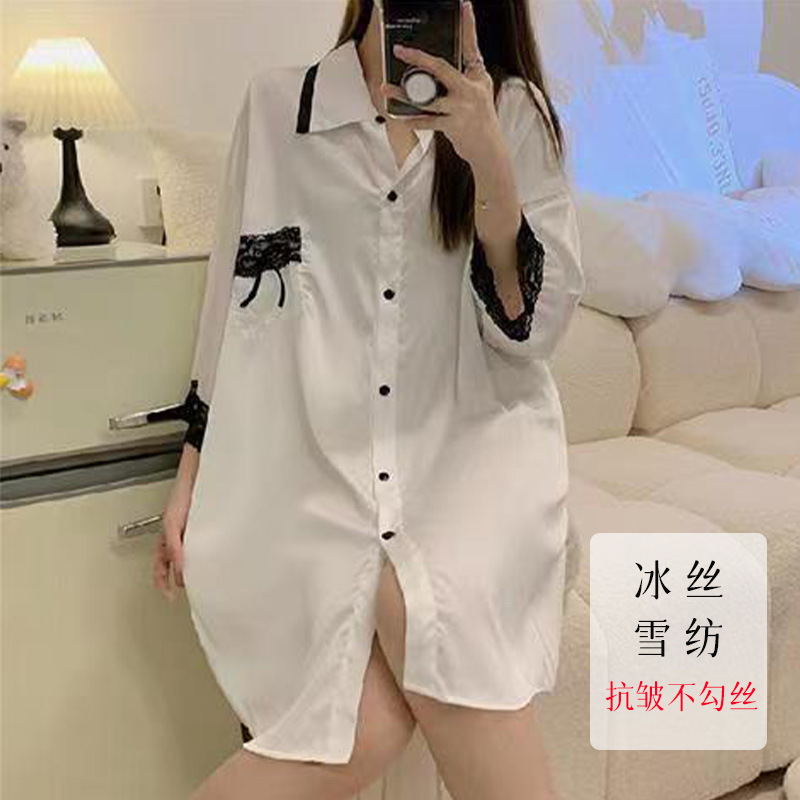 韓国版の寝スカートの女性の夏の氷の糸の薄いタイプのセクシーな中の長いタイプの彼氏の風のシャツの情調の服装の人のゆったりしている大きいサイズのパジャマ