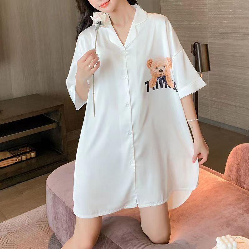 氷の糸の眠るスカートの女性の夏のinsの新型の漫画の熊の薄いタイプの半袖の中で長いシャツのパジャマの女性の高級感