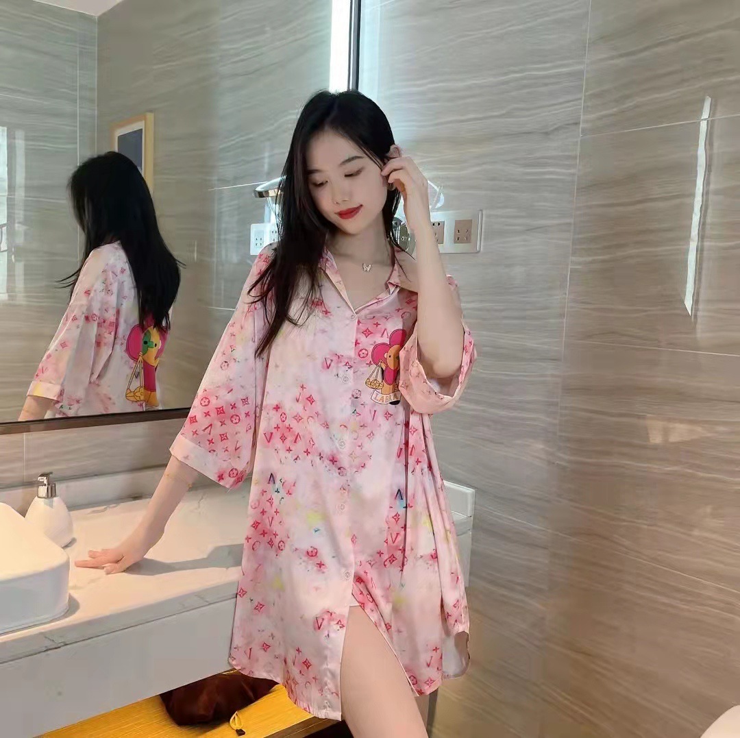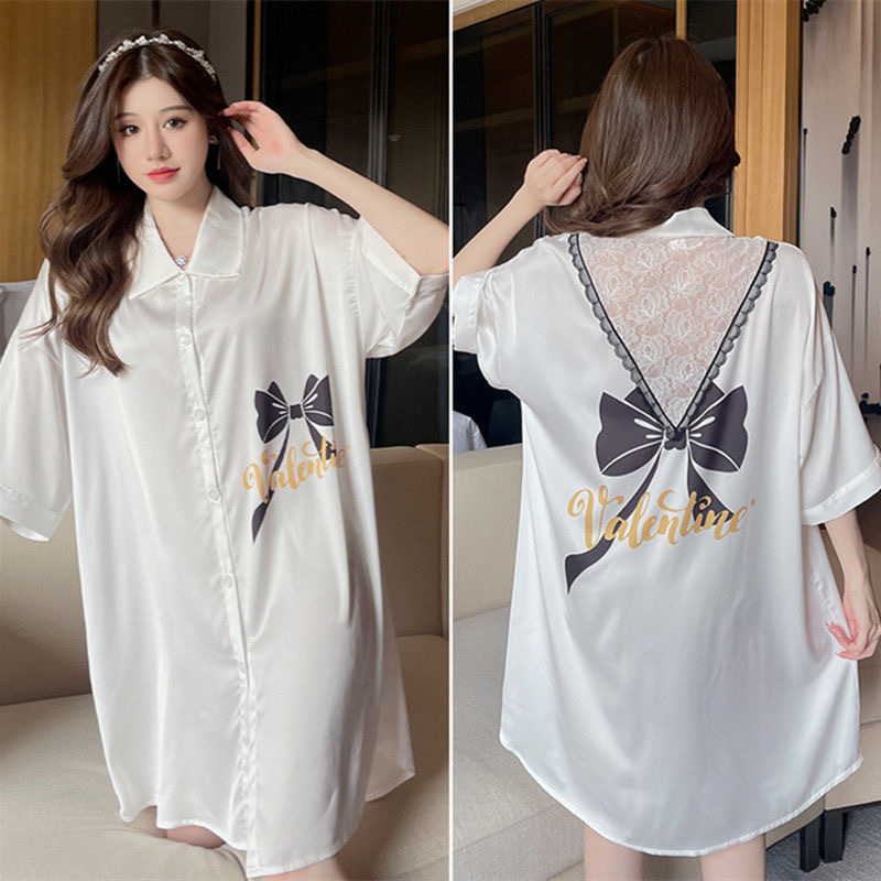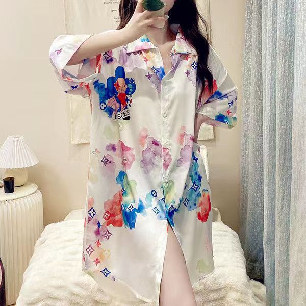 純粋な欲望の風、夏のカジュアルファッション、女性用アイスシルクシャツワンピース、ゆったりとした若いパジャマ、セクシーなホームウェア