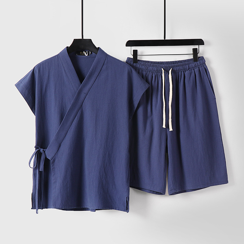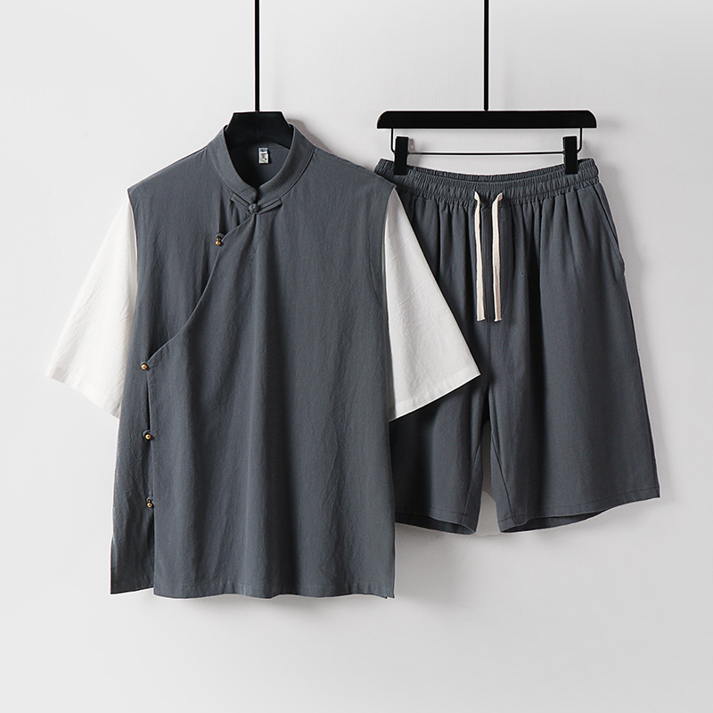 中国風ツーピース春と秋の半袖スーツメンズルーズコットンとリネン古代衣装茶漢服服禅服唐スーツ男性用