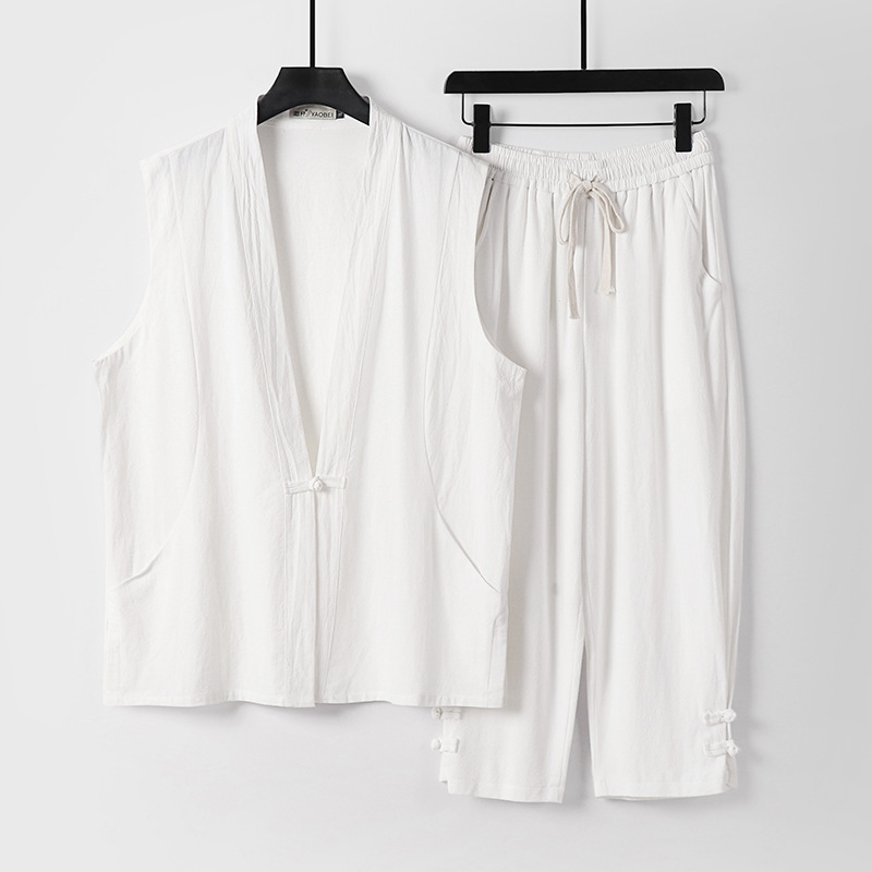 メンズ大きいサイズ中国風ベスト綿麻半袖レギンス中国風禅服茶仏レトロスーツ