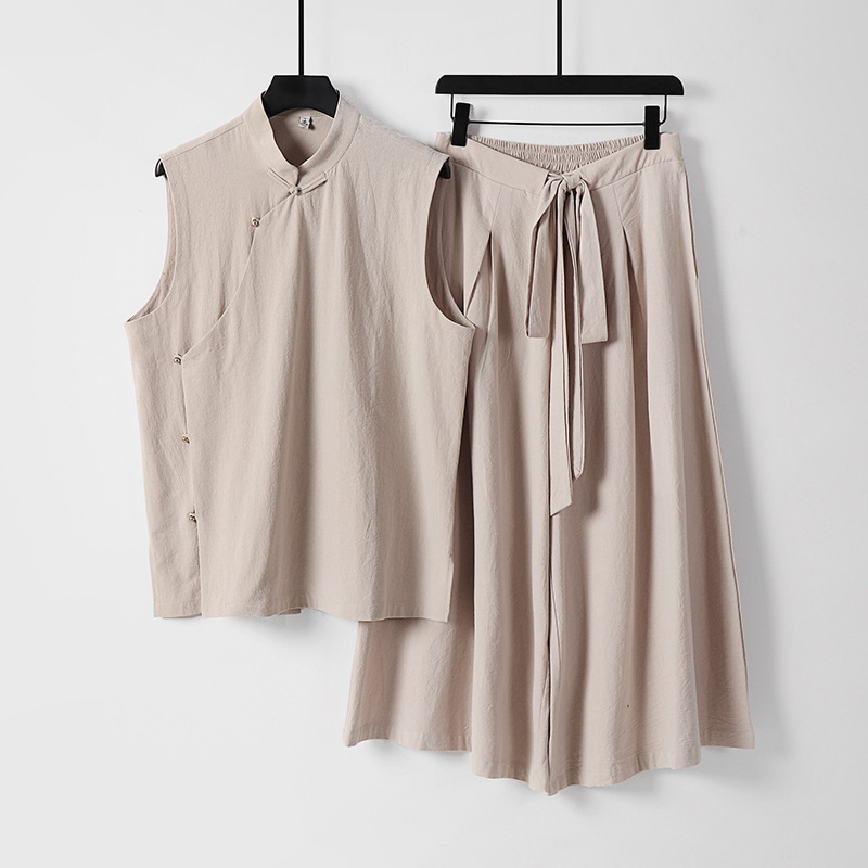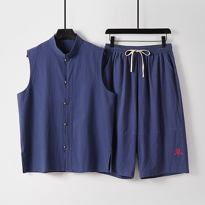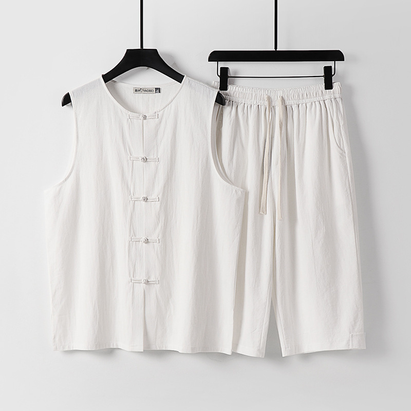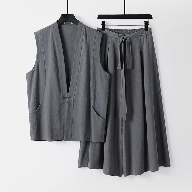 中国大きいサイズの綿とリネンのスーツメンズ夏のトレンディなブランドルーズ9点ワイドレッグパンツノースリーブカジュアルスポーツツーピーススーツ男性用