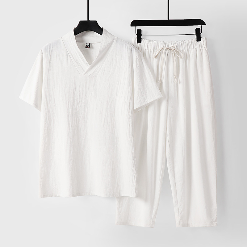 中国風の綿とリネンの七分袖Tシャツスーツメンズトレンディブランドルーズカジュアルユース大きいサイズ七分パンツツーピースセット男性用