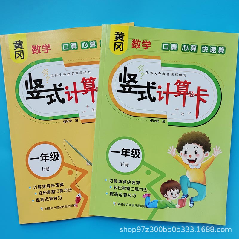 一年生の数学の算数の問題カードの上で下冊の人が版の縦式の計算問題を教えます。