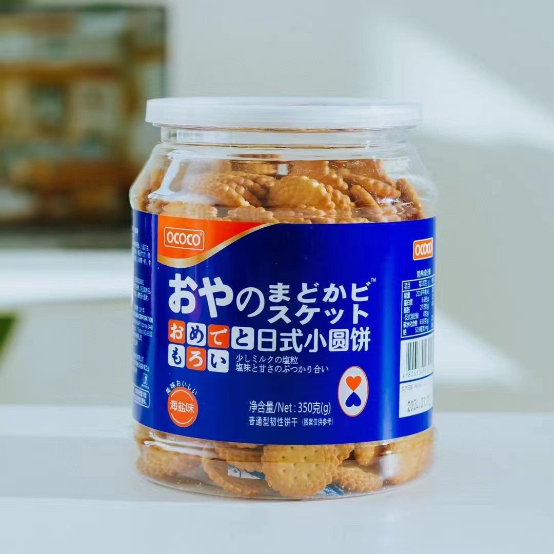 Ococo日本式の丸い餅の海塩の塩味のビスケットのエビの味噌の小さいビスケットのおやつの缶のネットの赤いレジャーのおやつ