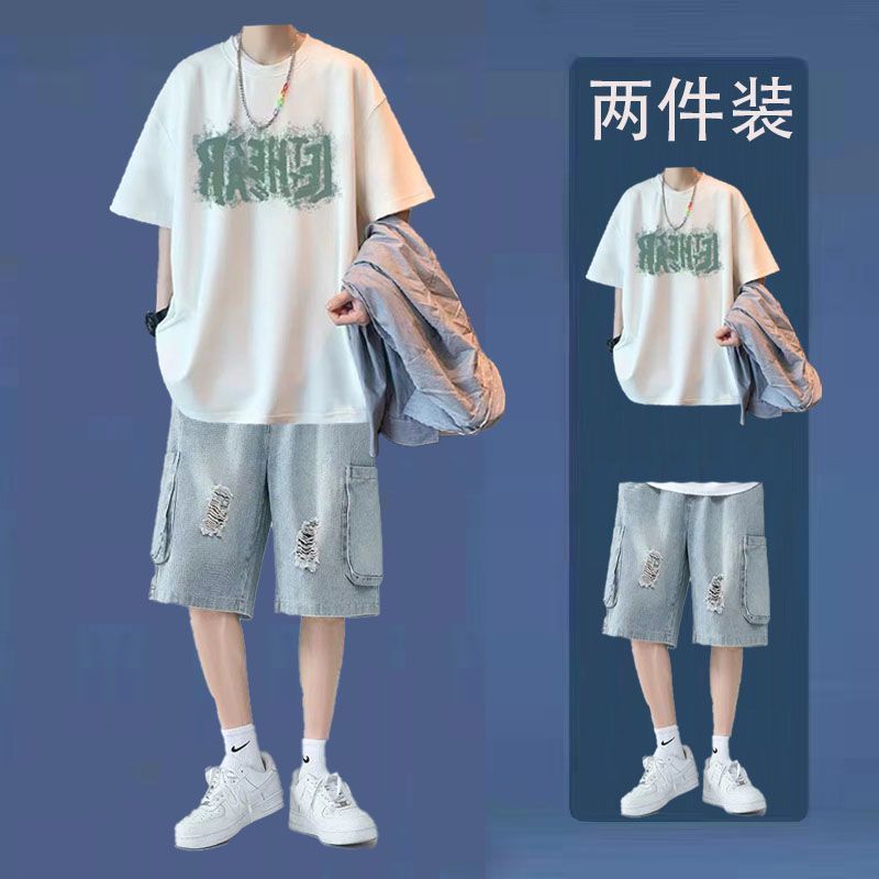 綿半袖Tシャツスーツメンズ夏トレンドデニムショートパンツルーズ紳士服セット2点セット