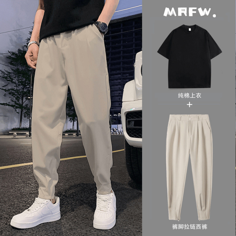 ハンサムなトレンディなブランドメンズスーツ夏薄いジッパースーツパンツ綿 Tシャツメンズハーレムパンツ 2 点セット