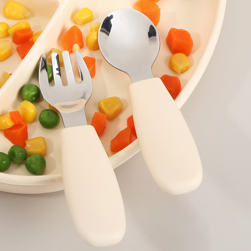 新商品の赤ちゃんのステンレスのフォークのスプーンのセットの子供の食器の短い柄の学食のシリカゲルのスプーンの短い柄の補助食の食器の卸売り