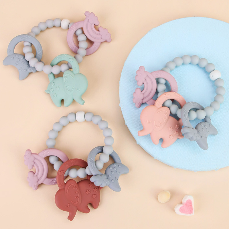 象の手の輪の歯のゴムの赤ちゃんはシリコンの歯のゴムをつかんで歯を磨いて空気を通して金をかじって赤ちゃんを噛んで手の神器を食べさせます。
