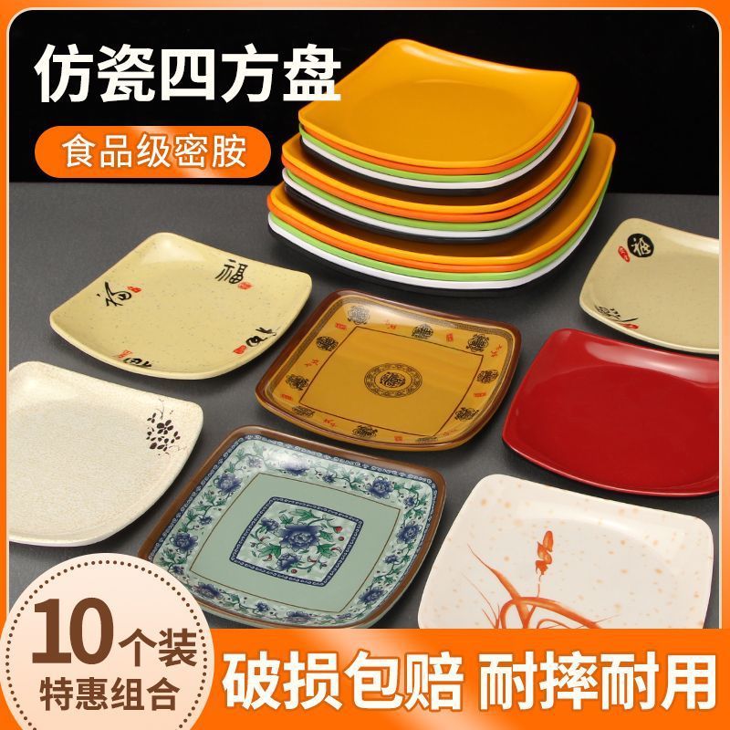 カラフルな模造磁器の正方形プレート、ファーストフード鍋プレート、炒め物、冷菜、丼、メラミン皿、骨皿、プラスチック