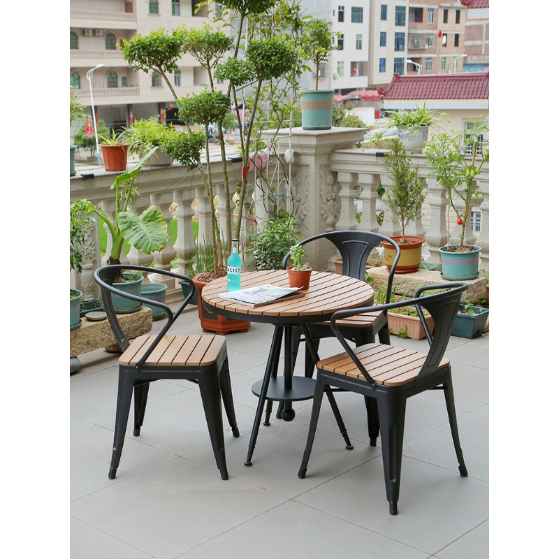防腐木のベランダのテーブルと椅子の屋外のレジャー別荘のコーヒーのミルクティーの店の庭の防水のプラスチックの木のテーブルと椅子の組み合わせのセット