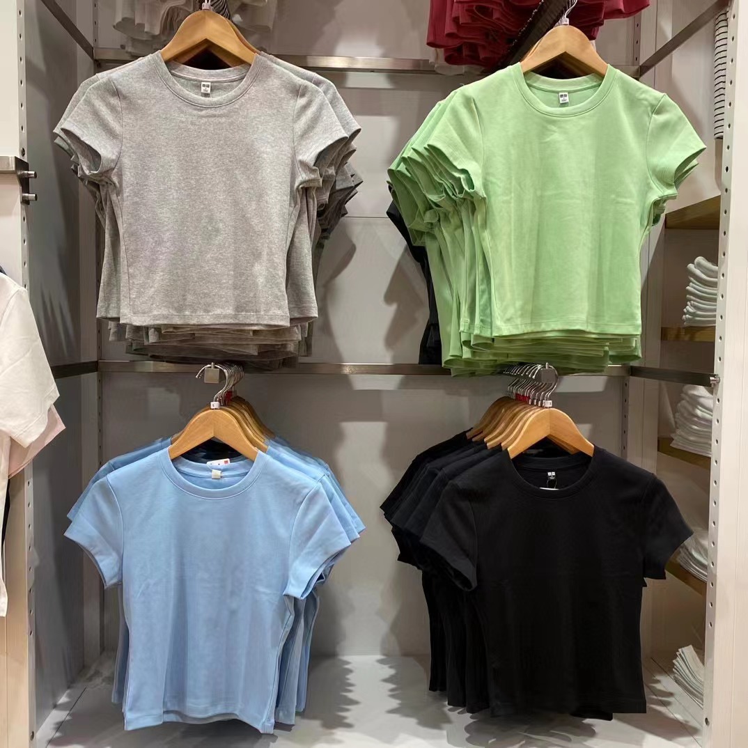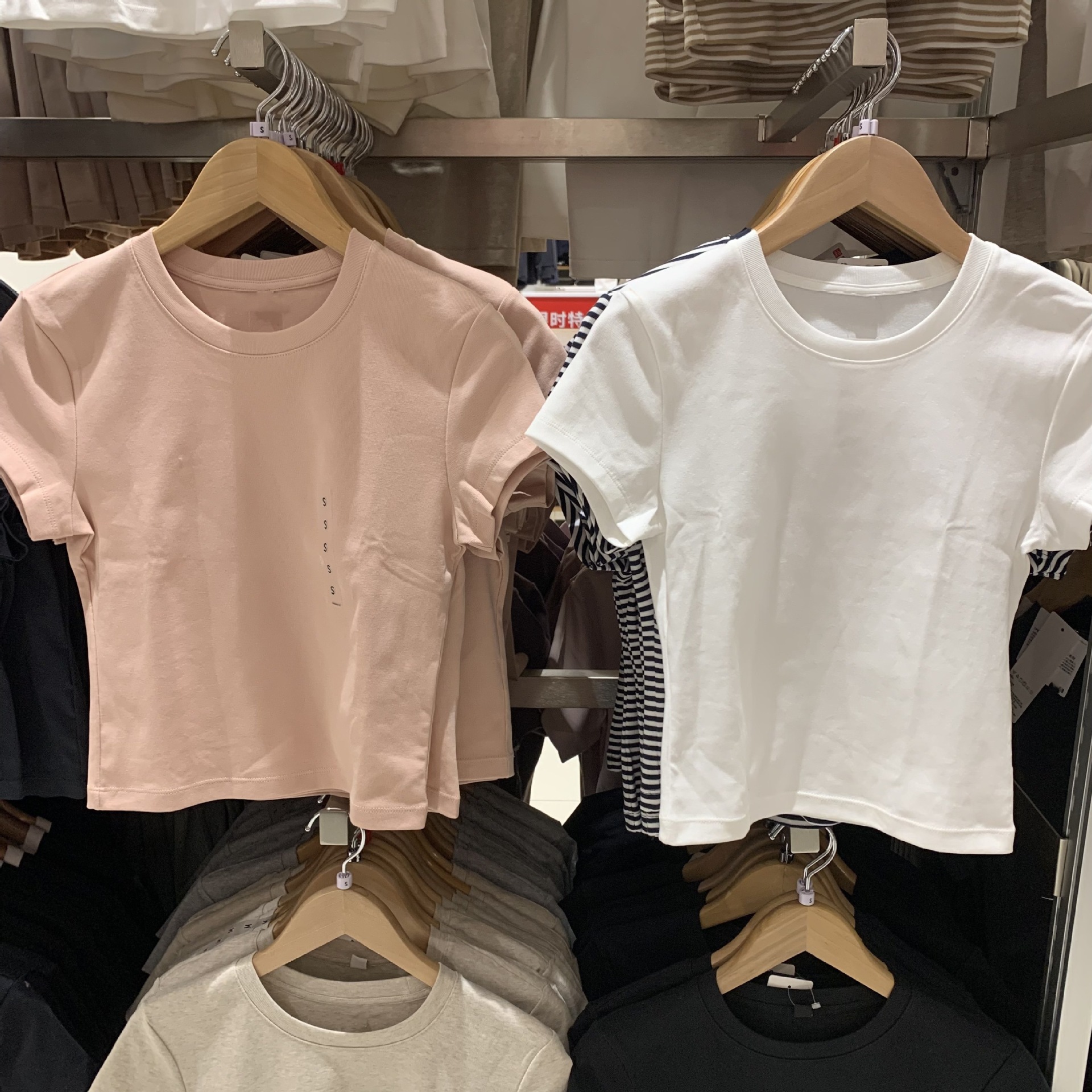 夏のホットガール T ラウンドネックハイウエストスリム Tシャツ甘辛スタイル半袖無地スリムボトム女性 465760