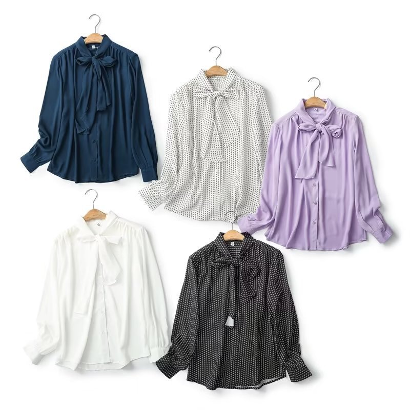 春の婦人服ジョーゼットリボンシャツルーズ長袖スタンドカラーレースアップ E455739 460891