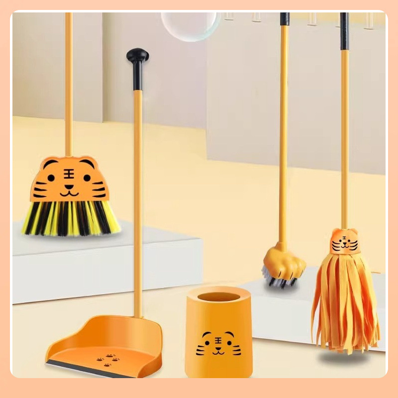 ✅家庭用の漫画のトラの箕のほうきの組み合わせの幼稚園の赤ちゃんは掃除をすることを学びます。