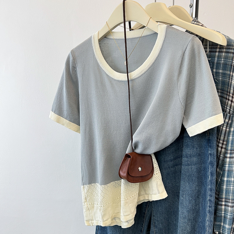 スポットグッズ!スポットグッズ!在庫に大きな写真があります! 2025夏 バックボタン痩身ラウンドネックシャツ ニットバットスリーブ