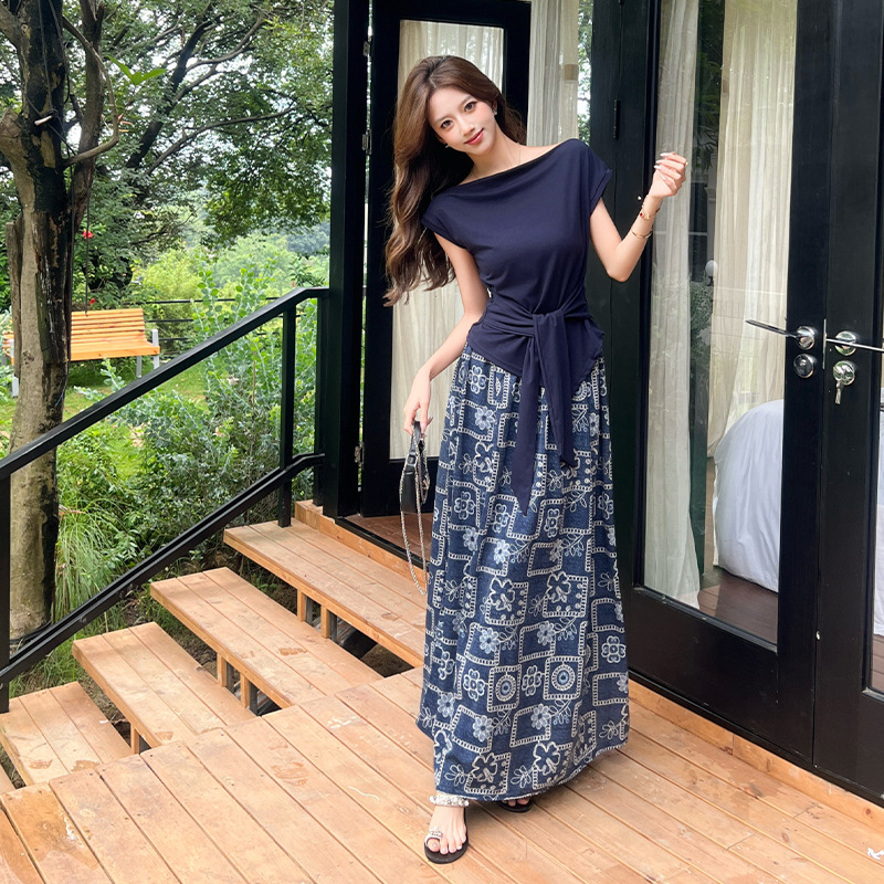 スポット韓国ファッションワンラインカラーレースアップシャツトップレトロプリントスカートスーツ女性のための 2025 夏の新