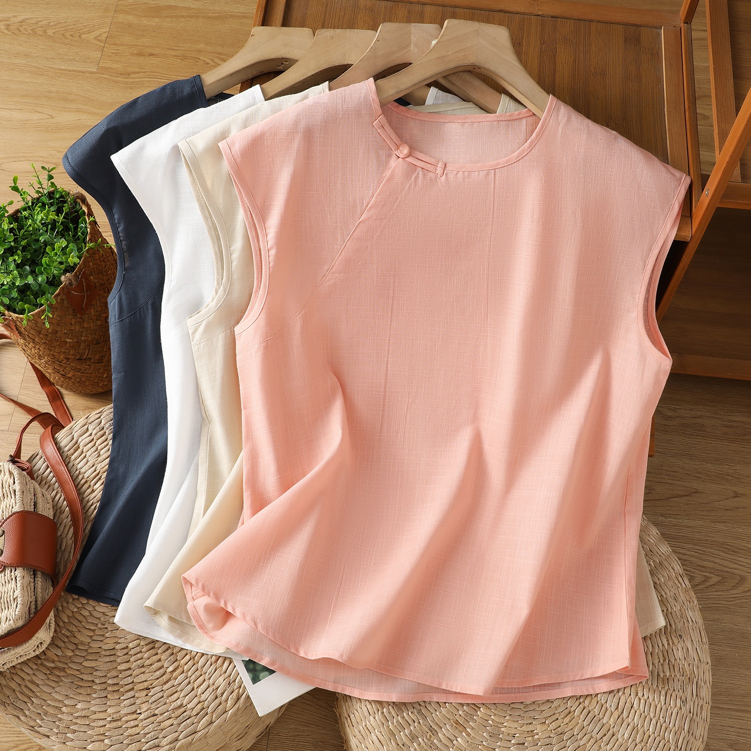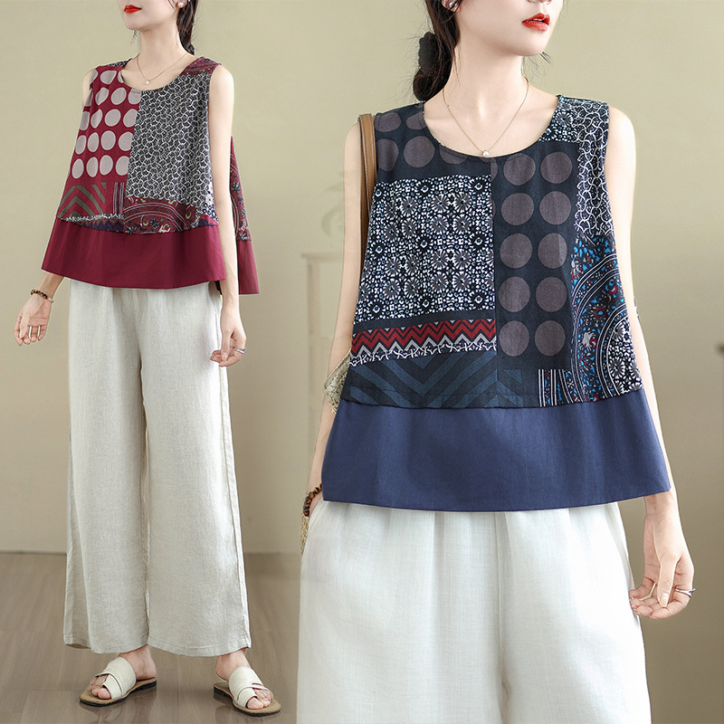 スポットコットンとリネンの水玉模様のノースリーブベスト女性用 2025 夏ルーズ文学風年齢軽減カジュアルベビードールシャツ