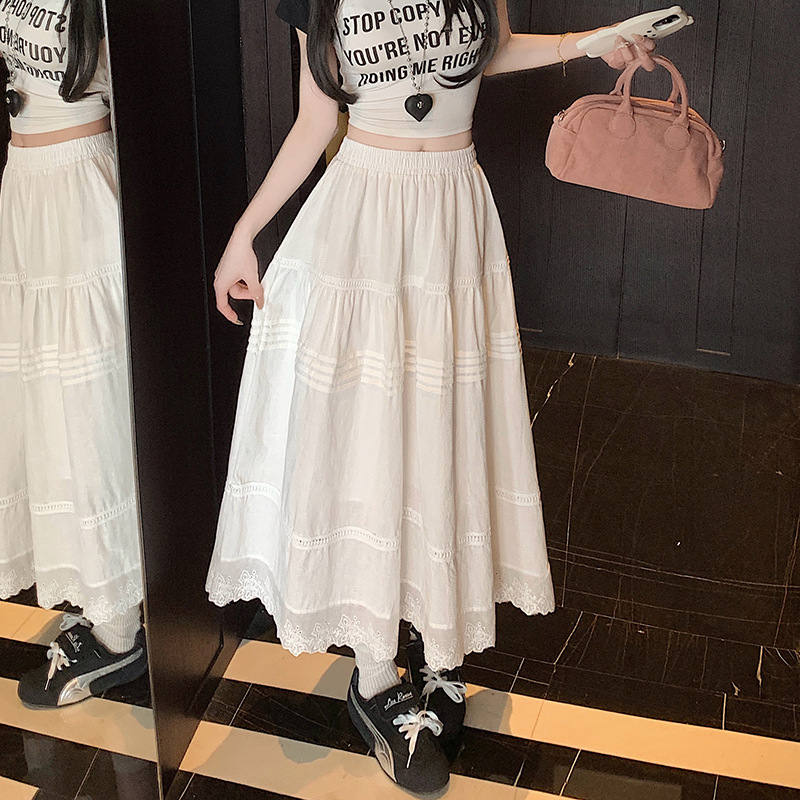 ホワイトデザインレースケーキスカート女性の春ハイウエストフレンチロングスカート大きな裾スカート