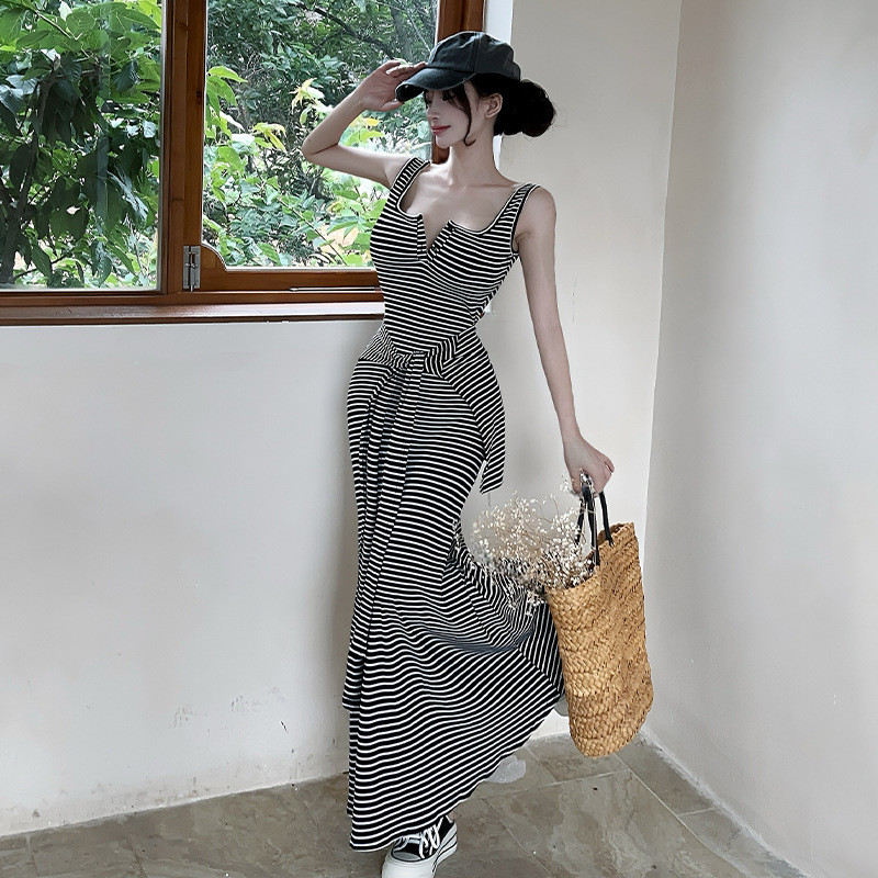 在庫ありコントラストカラーストライプサスペンダードレス女性の夏の胸パッド付きスリムウエストスカートデザインホットガールヒップカバーロングスカート