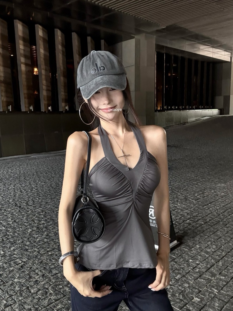 在庫あり、スイートクールホットガールホルターネックバックレスノースリーブキャミソールセクシースリムプリーツアウタートップ
