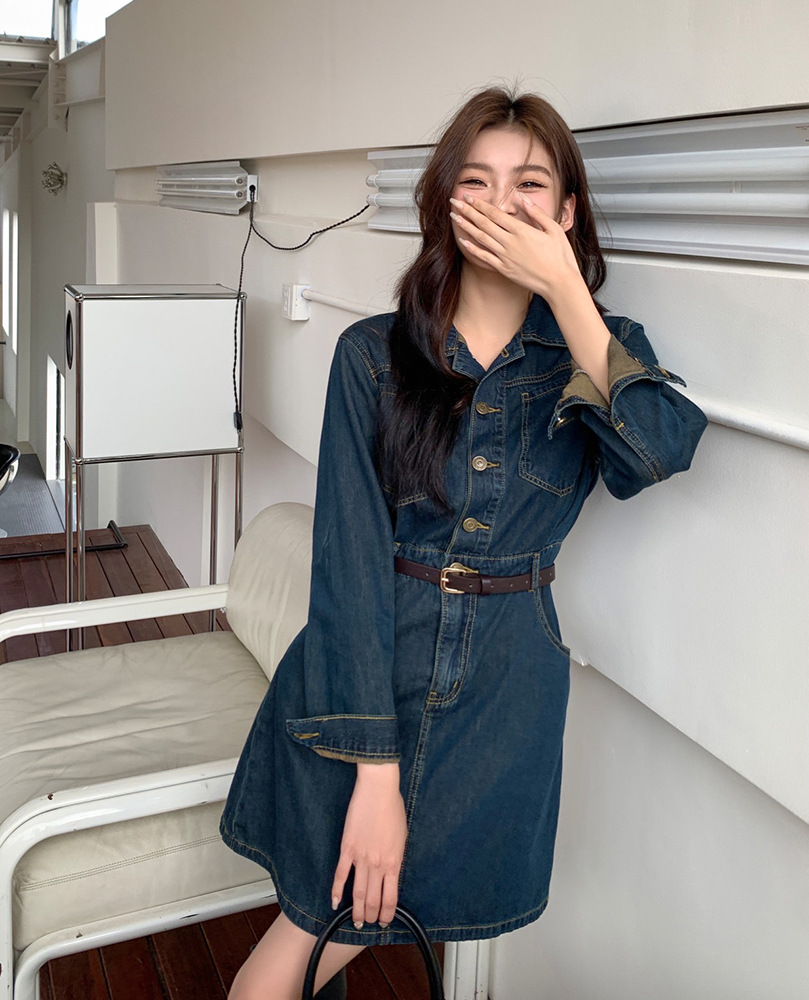 在庫あり 2025 秋冬新デザイン気質ウエストデニムドレスフレンチレトロシャツスカート女性用