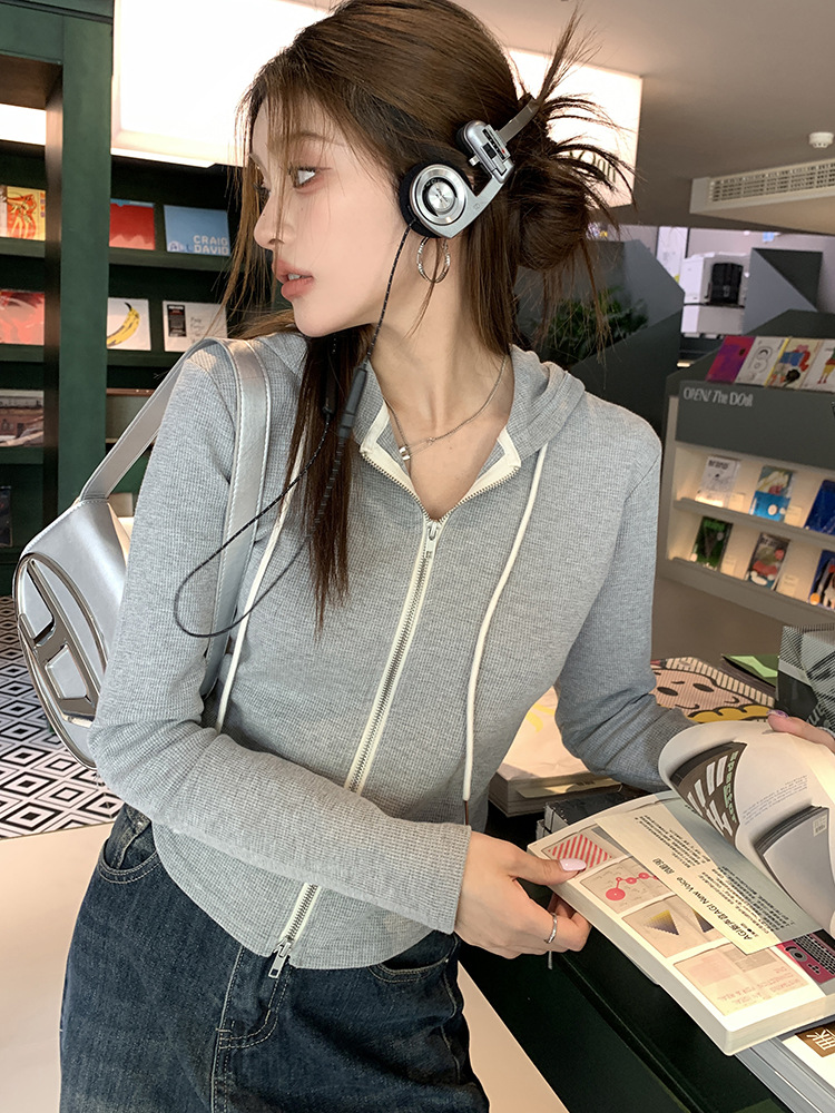 在庫あり 2025 秋冬新作スリムフィットショートワッフルパーカースウェットシャツレディース多用途ダブルジッパージャケットトップ