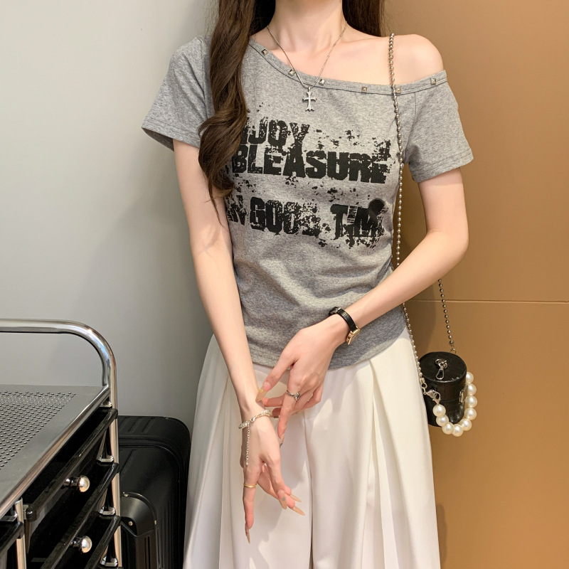 在庫あり アメリカンスタイル 斜め肩 レトロ ホットガール レタープリント 半袖シャツ レディース スリムフィット デザイン