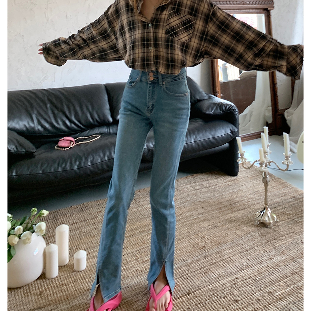 在庫あり 2025 秋冬新スタイルダブルボタンハイウエストデザインスリム箸脚スリットウォッシュブルージーンズパンツ女性用