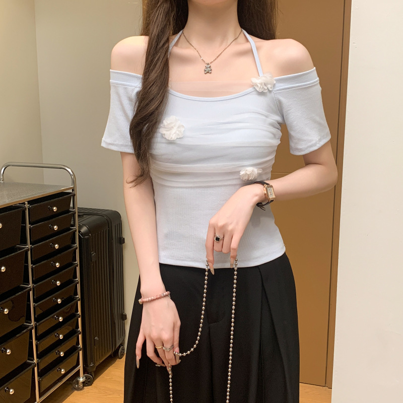 在庫あり、ニッチな夏の新しいスタイル、ハイエンドの立体フラワースリムフィットメッシュスプライシング半袖トップ