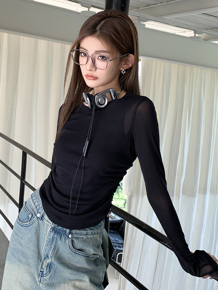 在庫あり 2025 秋冬新作ラウンドネック巾着デザインウエスト痩身トップシャツ女性のスリム長袖ボトリングシャツ