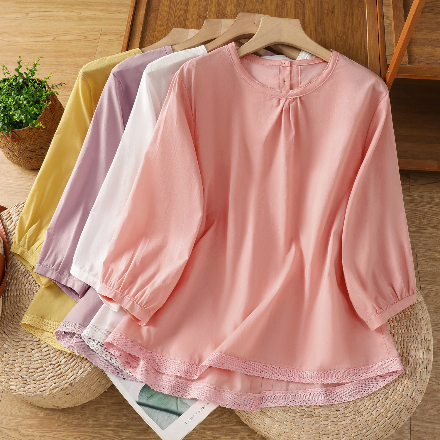 スポットレトロシャツレディースパッチワークレース裾シャツ無地リネントップ夏