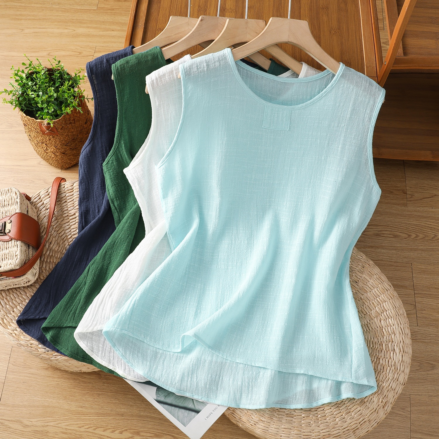 在庫ありレトロしわ加工ラミーベストレディースルーズノースリーブアウタートップスインナースリムで多用途夏3789
