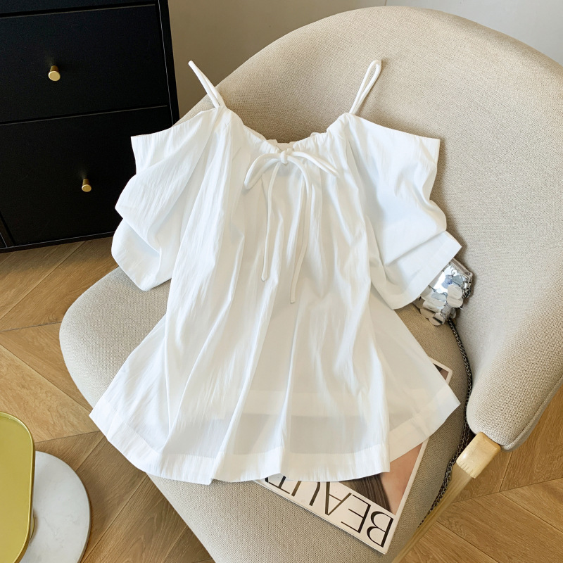 在庫あり ホワイト 年齢軽減 高級リゾート風 半袖サスペンダー 優しい風 オフショルダーシャツ トップス