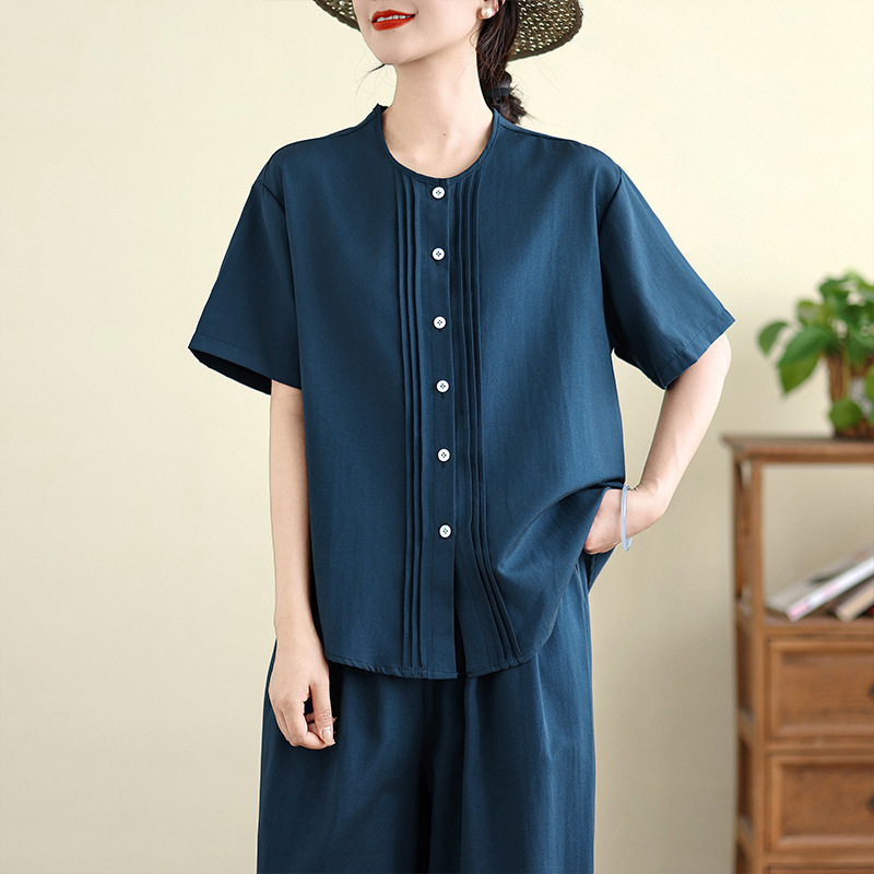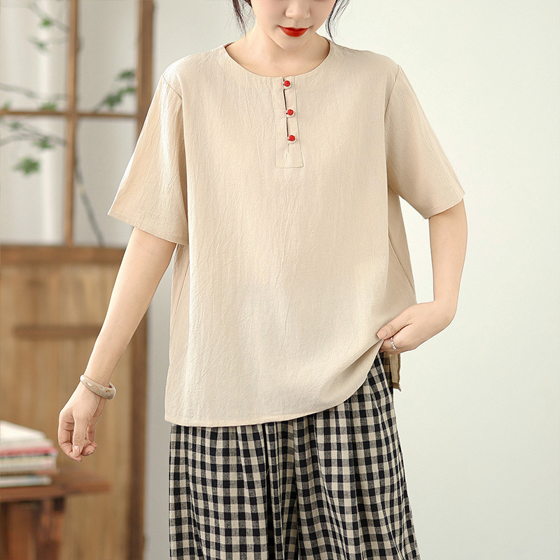 スポット新中国風夏仏教女性のリネン薄手半袖シャツ中国風ボタン茶服