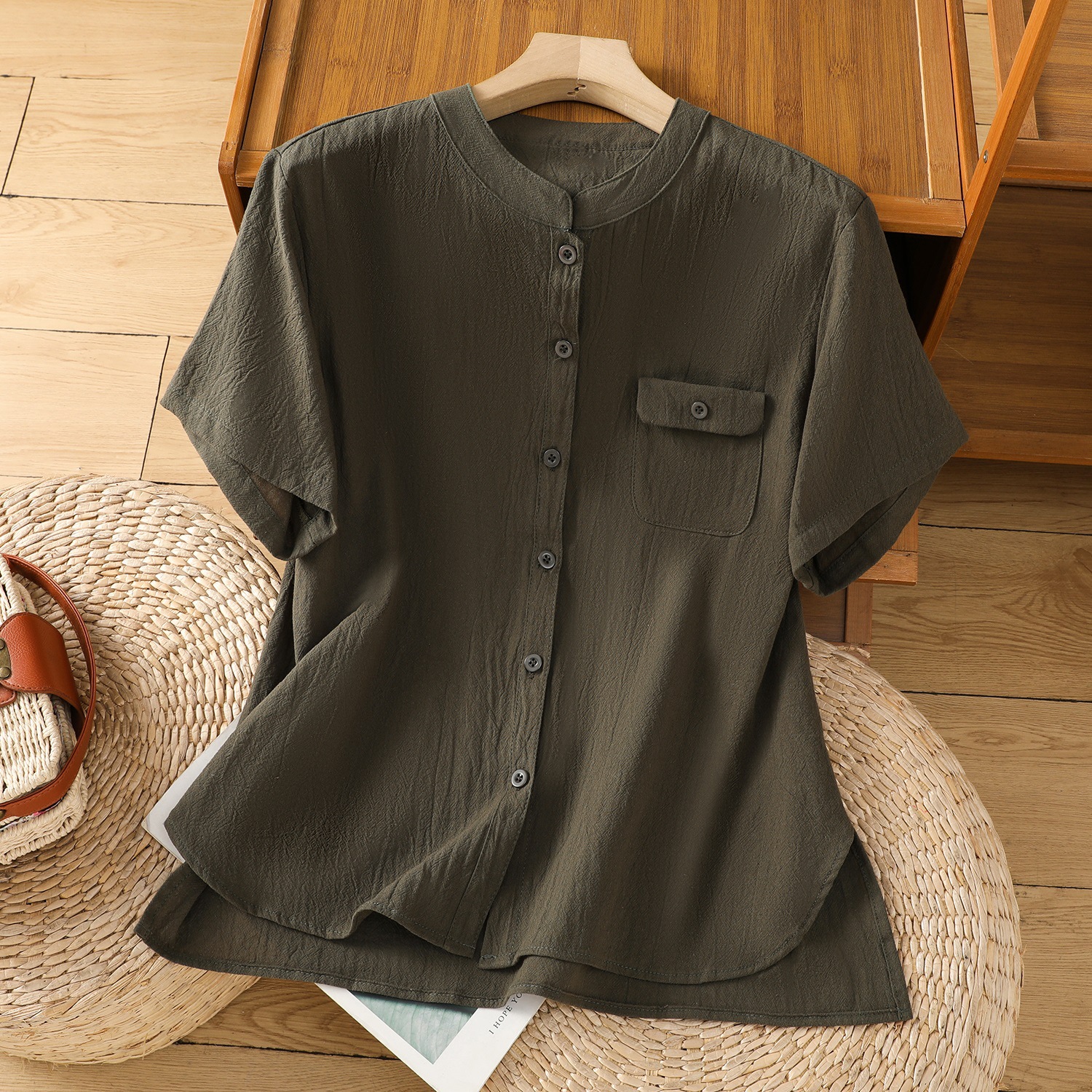 スポットリネンシャツレディースカラースタンドカラー半袖シャツプルオーバーカジュアルトップ