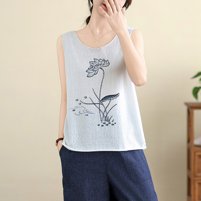 在庫あり 2025 春夏ボトムス綿とリネンの芸術的な手描きノースリーブキャミソールニットトップ女性用