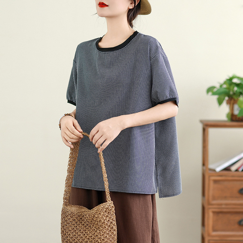 女性用の先染めチェック柄トップス、コントラストカラーのラウンドネック半袖ルーズサマープルオーバー、アーティスティックリネンセーター