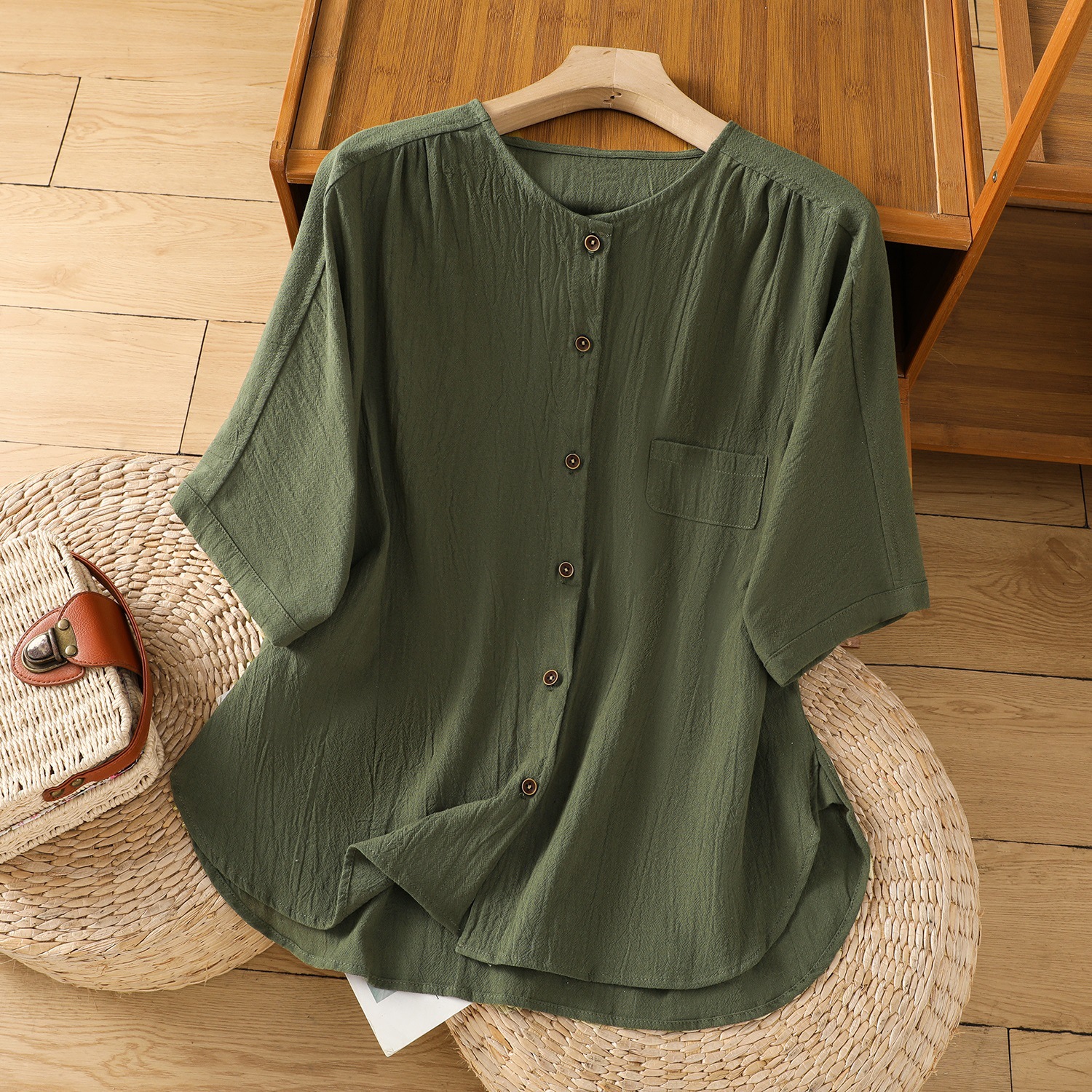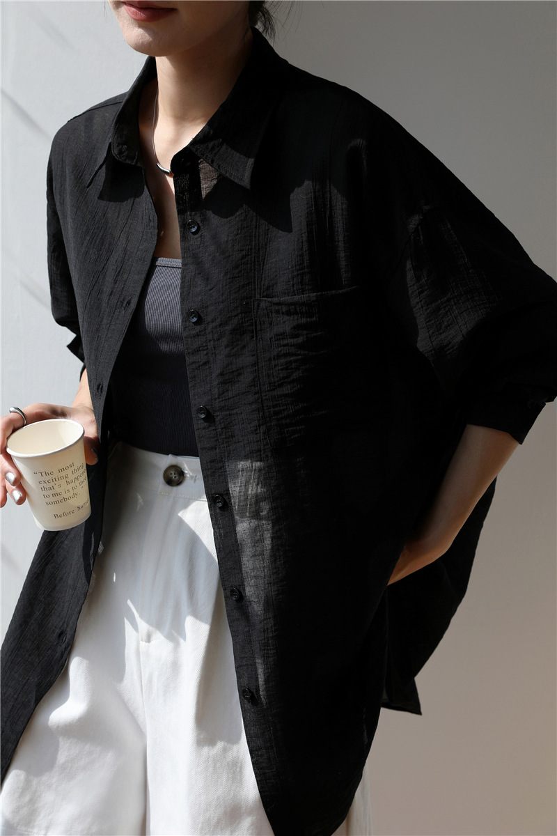 スポットリネンサンドウォッシュミッドスリーブシャツカーディガンレディースルーズ五分袖シャツジャケットカジュアルトップ